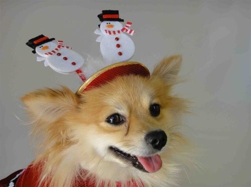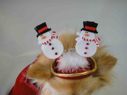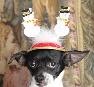 Very cute hat for dogs and cats. Made from velvet fabric decorated with a snowman swarovski crystal and feathers. Hat comes in one size that fit xs, s, m dogs ( tea cup ,small and medium) Hat stays in place with a adjustable elastic to fit all sizes. Your puppy or kitty wood look adorable in this hat . This is prefect accessory for an " elegant" pet for this christmas or new years.