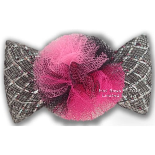 City Girl Hair BowThis 3.5' bow is for every girl! A classic city must have in black mesh with silver woven throughout. Adding a pink and black tulle pom to the center makes it perfect for all girls.Attachment options :