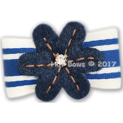 Shades of blue with a beautiful felt top-stitched flower and a crystal center on a blue and off-white ribbon. Approx 1.75" wide; stiffened for extended wear.