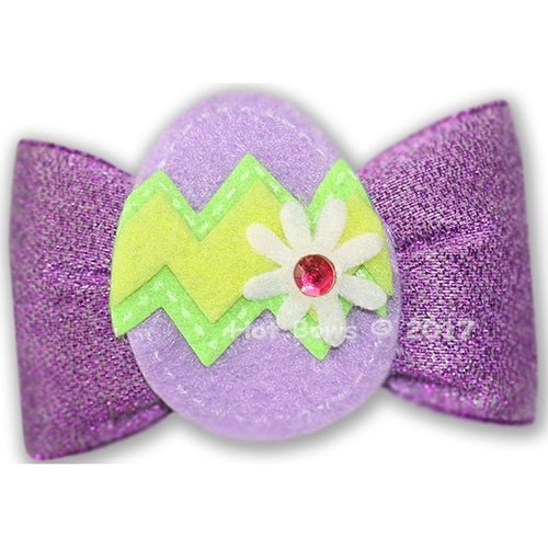 A sparkly purple wide purple ribbon with a purple felt Easter egg, adorn with a flower and a crystal. Approx 2.5" wide; stiffened for extended wear.