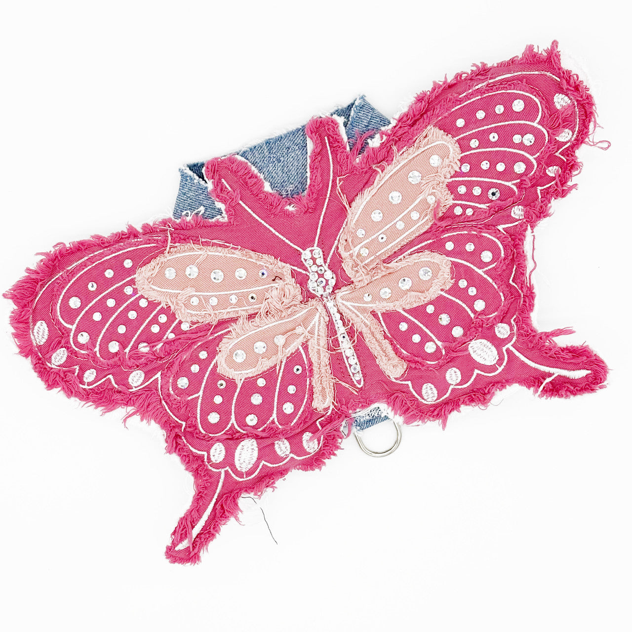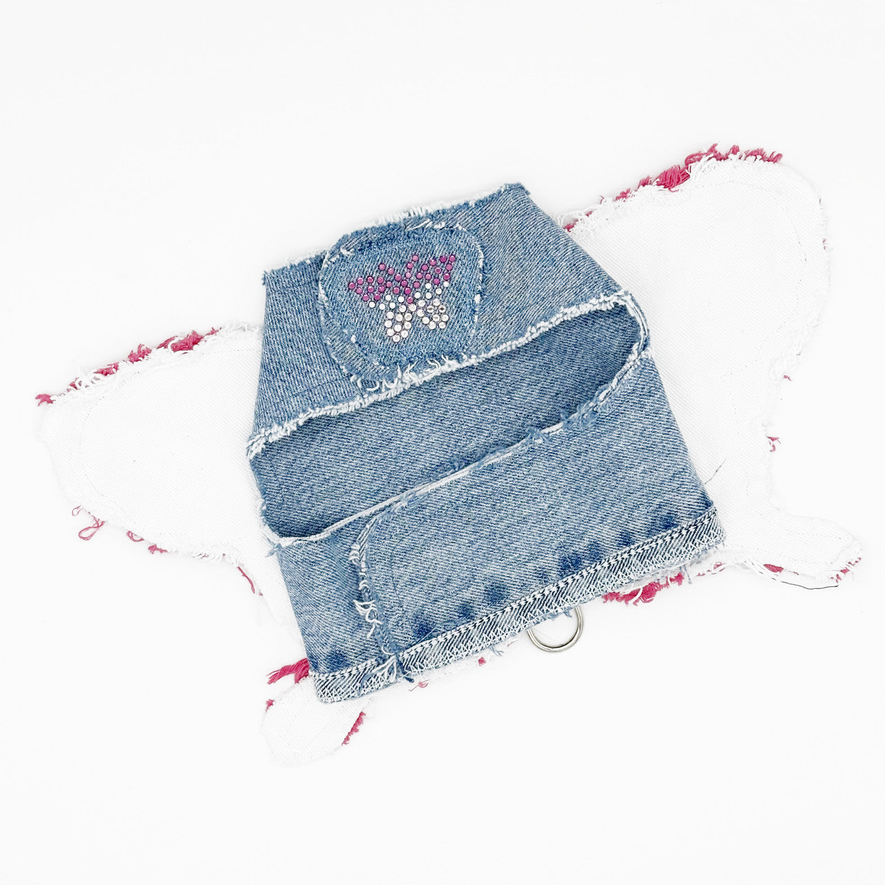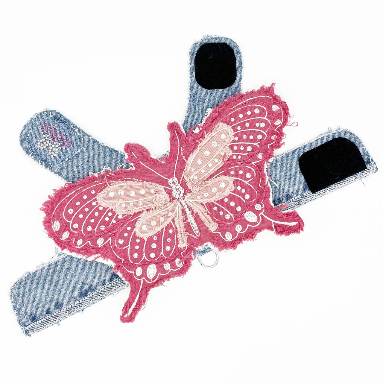 Soft, sweet, and full of sparkle—our Butterfly Denim Dog Harness Vest is a magical addition to any pet’s wardrobe. Crafted from repurposed blue denim with butterfly in pink and purple hues, this vest features a frayed butterfly patch adorned with shimmering rhinestones. As your dog or cat walks, the wings gently flutter, creating an enchanting effect that’s sure to turn heads.