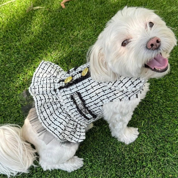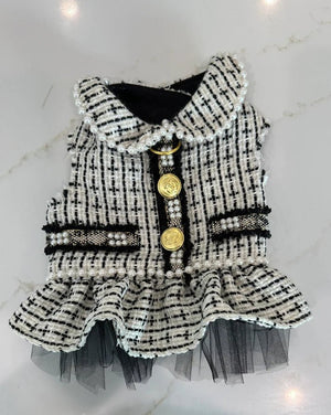 Transform your furry friend's style with our trendy Blue Tweed for Spring, taking inspiration from Chanel and featuring stunning gold accents. Also available in Black/White and Pink. Available in seven sizes to fit any pooch. This high fashion dress is perfect for fashion lovers who value easy sophistication. The D-ring guarantees ultimate safety during walks. Please see size chart in last photo.