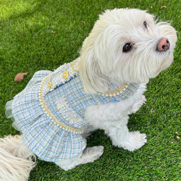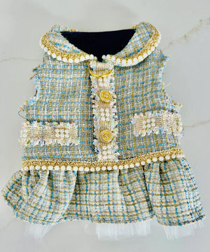 Transform your furry friend's style with our trendy Blue Tweed for Spring, taking inspiration from Chanel and featuring stunning gold accents. Also available in Black/White and Pink. Available in seven sizes to fit any pooch. This high fashion dress is perfect for fashion lovers who value easy sophistication. The D-ring guarantees ultimate safety during walks. Please see size chart in last photo.