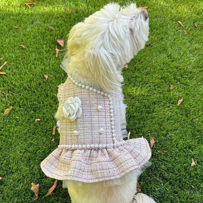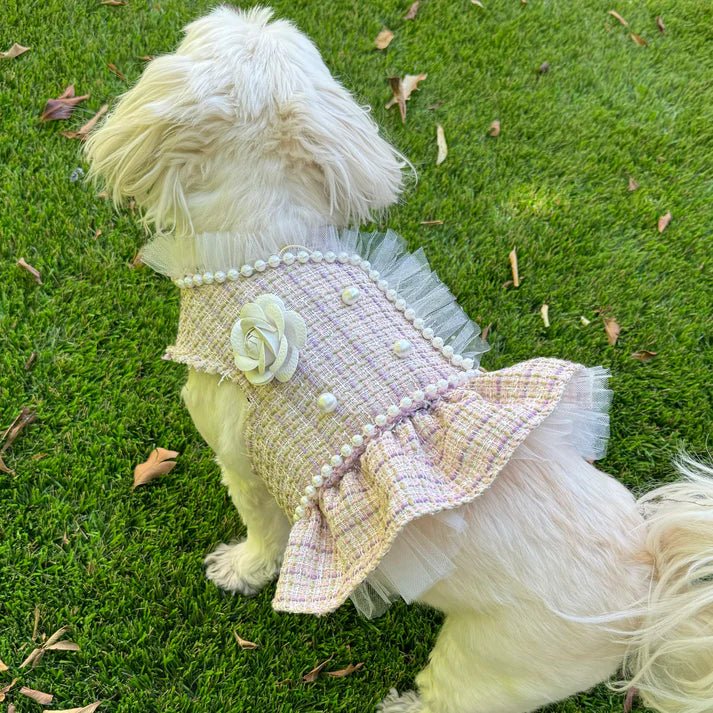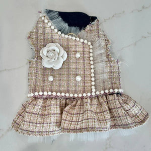 • Transform your furry friend's style with our trendy Blue Tweed for Spring, taking inspiration from Chanel and featuring stunning gold accents. Also available in Black/White and Pink. Available in seven sizes to fit any pooch. This high fashion dress is perfect for fashion lovers who value easy sophistication. The D-ring guarantees ultimate safety during walks. Please see size chart in last photo.