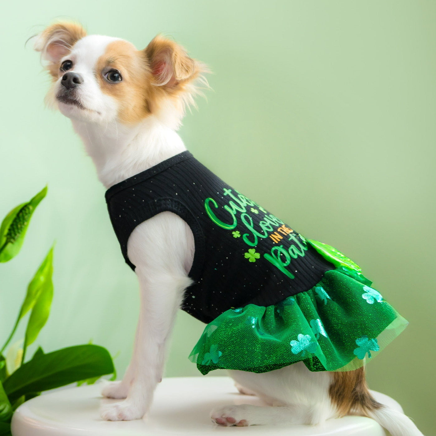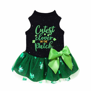 Deck out your canine companion in the sensational "Cutest Clover in the Patch" doggie dress. Designed for pups who love to shine, this dress dazzles with sequins atop, reflecting the sparkling atmosphere with every step. Its comfortable round neckline and cute green bow make it an essential for St. Patrick's Day celebrations. Let your furry friend steal the show and bask in the limelight!