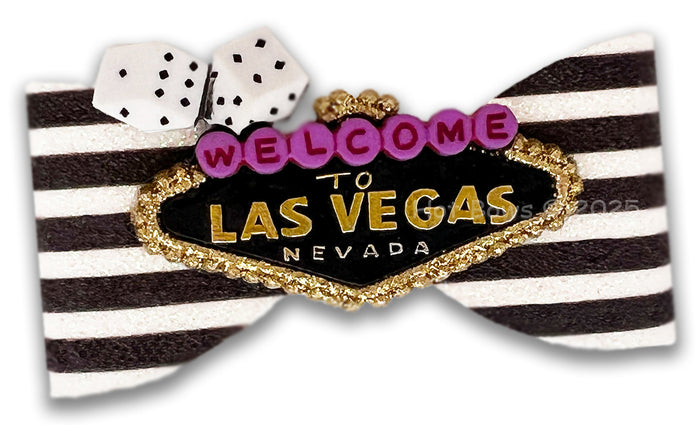 Bold black and white stripe fabric with the iconic Vegas sign and glittery accents. This bow brings all the sparkle and fun of the Strip! Stiffened for extended wear, Party size, approx 2.5" wide.