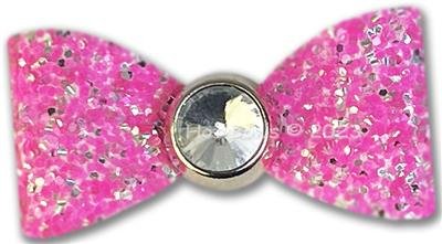 Neon pink and silver sparkle fabric with a large center crystal! Stiffened for extended wear.