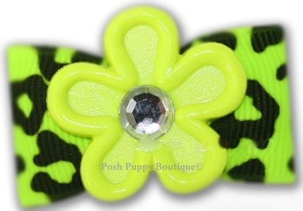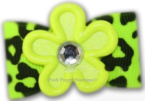 Bright color neon lime animal print grosgrain ribbon with a pretty flower with crystal accents in the center. Stiffened for extended wear; approx 1.75" wide.