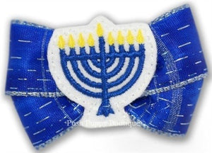 Festival of Lights Dog Hair BowFestival of Lights – Hanukkah Menorah is the center of this holiday themed double Hot Bows on royal blue ribbon with flashes of silver. Stiffened for extended wear; approx. 3” wideAttachment options :