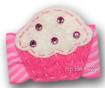 Sweet treat! White frosted cupcake with pink crystals on a matching woven ribbon.