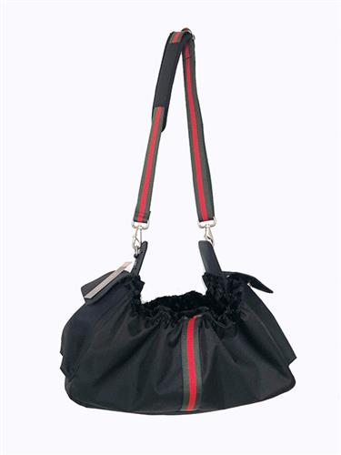 Introducing the newest Gigi Sling Bag.  Everyone loves our easy Gigi sling bag! Take your dog everywhere in our newest fashionable sling bag! The lightweight Gigi Sling bag is made from lightweight black polyester material with chic red and green fashion stripe details.