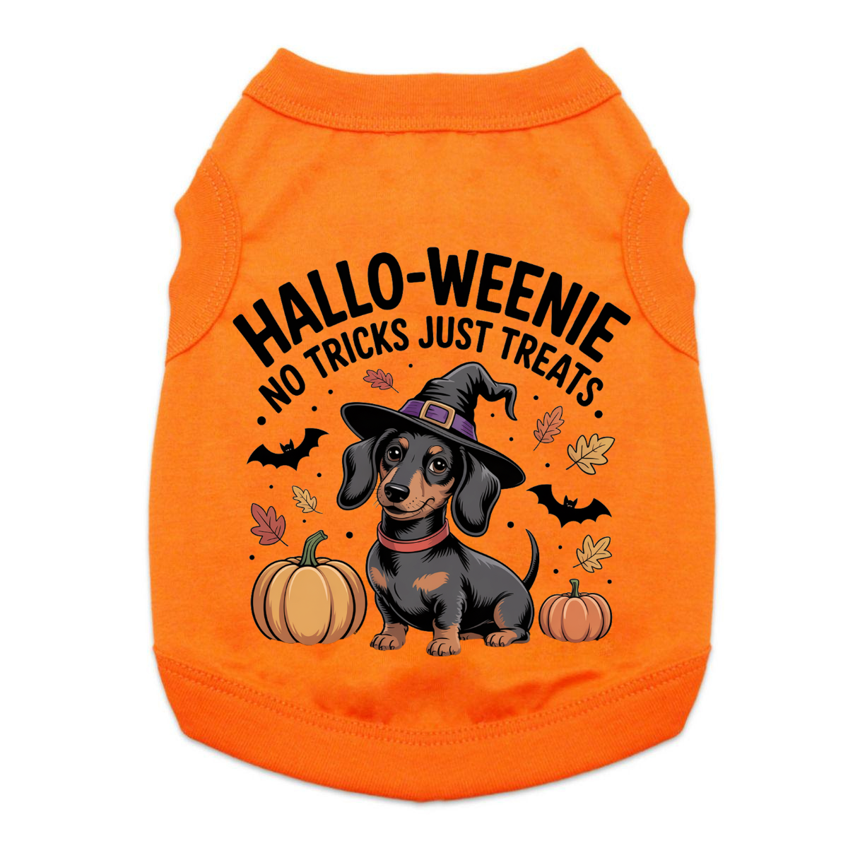 Celebrate the spooky season with the Hallo-Weenie Shirt! Featuring the playful phrase "no tricks just treats," this cozy pet shirt adds a festive touch to your furry friend's wardrobe. Perfect for Halloween parties or cozy autumn strolls, it keeps your pup comfy while spreading seasonal cheer.