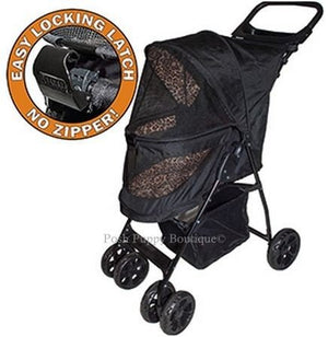 Happy Trails Lite NO-ZIP stroller. No zippers means no hassle when trying to open and close the stroller. Our new NO-ZIP technology means that you can easily gain access to your pet without fumbling with difficult zippers! The Happy Trails Lite NO-ZIP stroller also features an elevated paw rest. Your pet can easily look out of the stroller by using the front bar for support. The new panoramic view window allows your pet to remain safe inside of the stroller without missing any sights while you stroll!