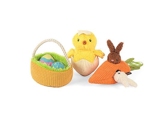 Surprise your pup with this eggs-tremely cute Hippity Hoppity Toy Collection! Every bunny will love trying to capture these two Funny Bunnies from inside the carrot toy, going on an Easter egg hunt to fill their Egg-cellent Basket, plus you’ll crack up watching your dog play with the Chick Me Out toy.