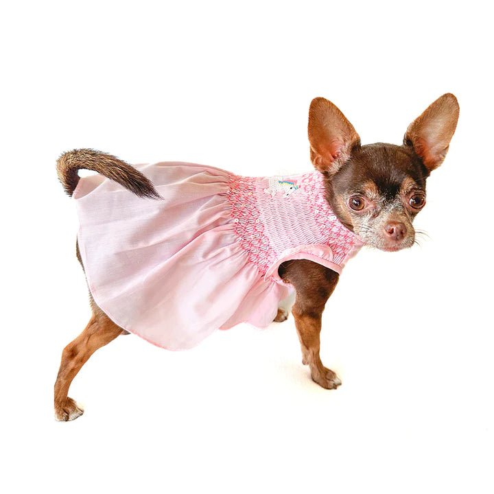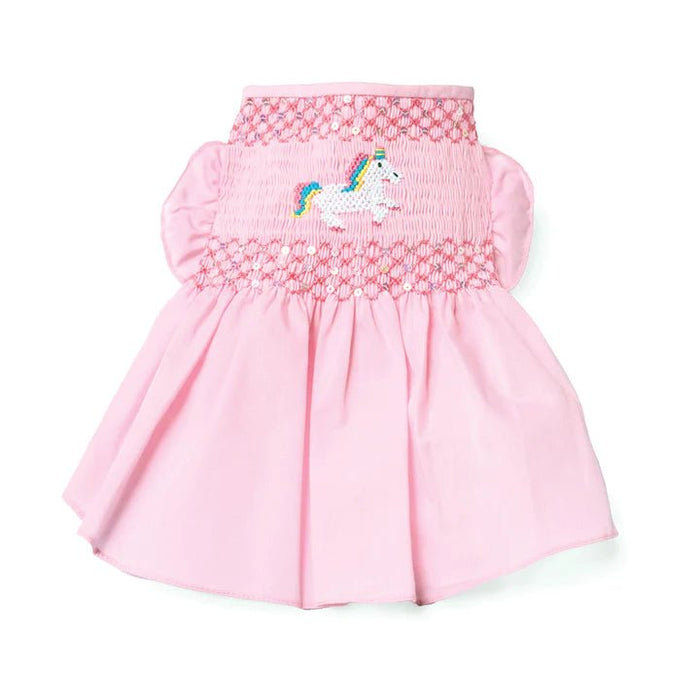 Step into a world of whimsy with this enchanting, hand-smocked cotton candy pink dress. It's adorned with an embroidered unicorn stitched by hand, sporting a rainbow mane and tail that practically sparkles. Hand sewn iridescent sequins add a magical touch. Vibrant pink geometric stitching and hand-smocking adds a playful contrast, and the ruffle sleeves are the icing on this magical confection of a dress. Your pup will be the envy of the town!