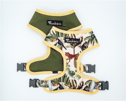 Fun and intriguing this print brings you into the wild, into the lush foliage of the jungle. "Into the Wild" is an animal lover's delight with an infusion of jungle animals. The reverse is a deep olive, a color that compliments everyone and a powerful contrast from yellow trim.