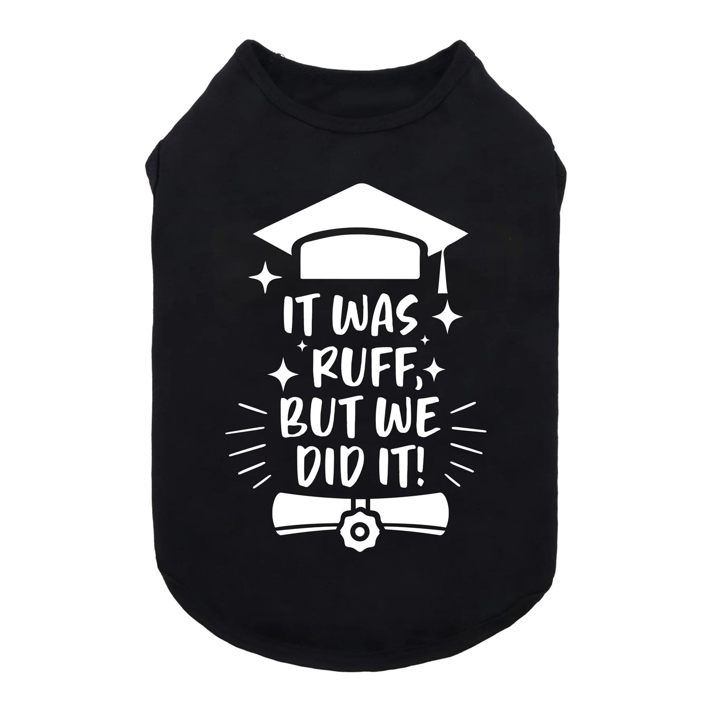 Celebrate your dog's achievements with our humorous "It Was Ruff, But We Did It!" tank top, perfect for graduations and special occasions. The lightweight design keeps your pup cool while the striking print ensures attention and smiles.
