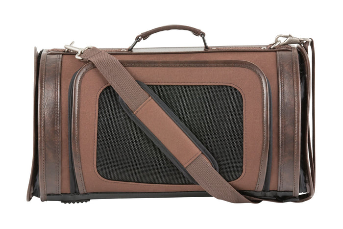 Front and side ventilation windows, adjustable padded shoulder strap that also can be used as a leash, non-collapsible, custom hardware, made in the USA, airline approved, detachable fur lined pad. This carrier is also equipped to be used as a kennel when traveling with your pet. Its a home ways from home!