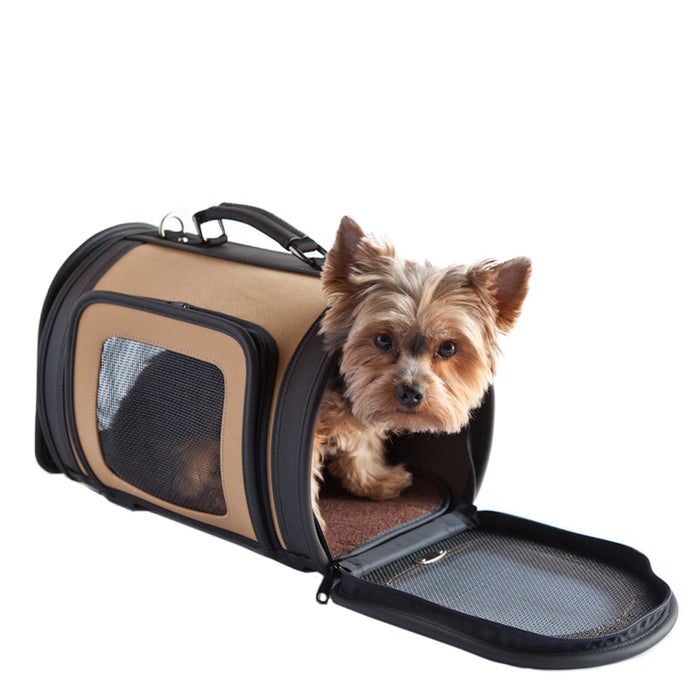 Front and side ventilation windows, adjustable padded shoulder strap that also can be used as a leash, non-collapsible, custom hardware, made in the USA, airline approved, detachable fur lined pad. This carrier is also equipped to be used as a kennel when traveling with your pet. Its a home ways from home!