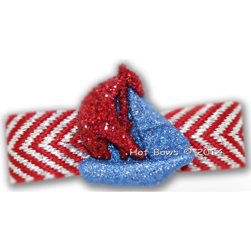 Perfect way to sail around your local shores. Red and silver woven chevron with a blue and red glitter sailboat center. Stiffened for extended; approx 1.75" wide; ribbon 1/2" wide.