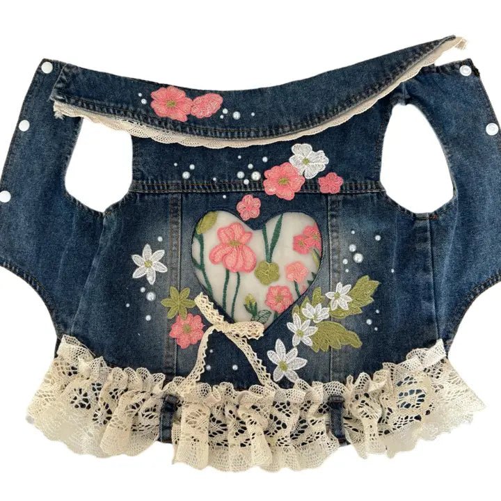 This beautiful vest features a sheer panel heart lined in adorable floral fabric. It is handcrafted with love in Los Angeles. It comes in six sizes and has a secure snap closure. Sprinkled with elegant pearl and crochet lace detailing that adds the perfect amount of drama. See the size chart on the last photo to make sure you get the perfect fit!