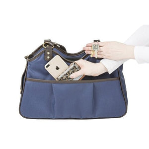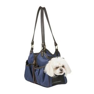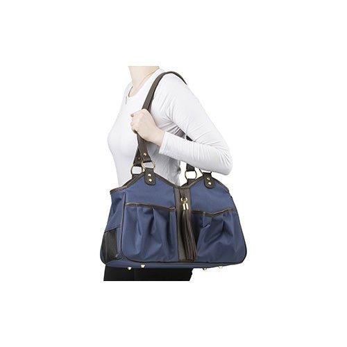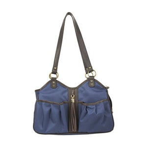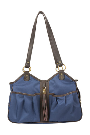 Metro Couture Navy With Brown Leather Trim & TasselThe Navy metro bag is updated with rich brown leather trim, leather straps, & leather tassel detail. The Navy Couture Metro Bag has all of the features your customers are looking for including: lightweight, easy to clean navy polyester fabric, signature hardware, roll-up side windows, 3 mesh windows, inside adjustable safety hook, 2 deep outside pockets for storage, 1 zippered side pocket for additional storage, removable faux fur bedding, and waterproof nylon lining for easy cleaning. Large Metro 2 bag offers an option to carry two small dogs in one bag. The large size Metro 2 has two roll-up side windows--one on each end. The Metro Bag is airline approved for travel on most flights. Made in the USA.