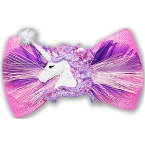 Hand glittered unicorn with pink and purple feathers on a pink ribbon. There is a small pom pom added to the unicorn horn for the safety of your pets. Stiffened for extended wear; approx. 2” wide; ribbon 1.5”.