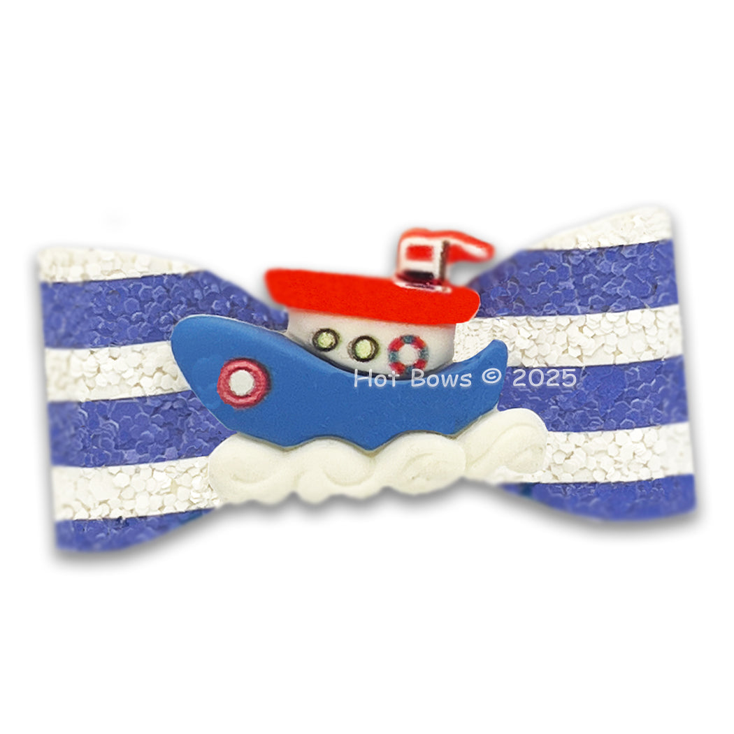 This nautical-themed dog hair bow features bold blue and white stripes with a playful red, white, and blue boat riding a wave at the center. A charming choice for any pup ready to set sail in style! Stiffened for extended wear; approx. 2" wide.