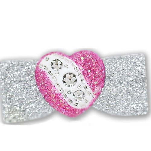 A custom glittered sparkling heart on a silver glitter ribbon Stiffened for extended wear; approx 2" wide; ribbon 1' wide.