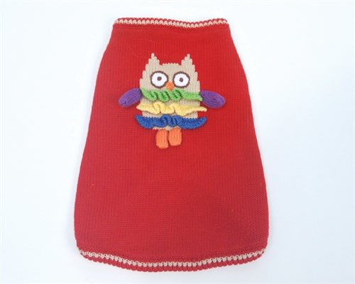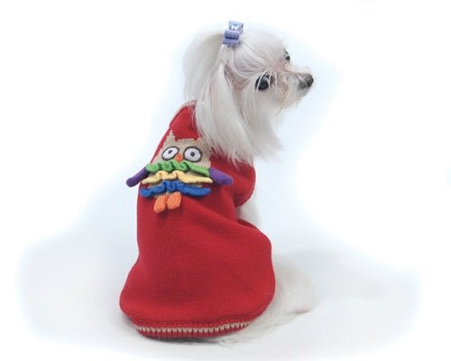 Whose dog doesn’t walk all over us? A charming sweater with a custom owl created with brightly-colored ruffled “feathers” and wings, this sweater is sure to be a favorite this fall and into the cooler seasons. Available in pink for pinkaholics and red for those who love a bolder primary colored look. Knitted in organic cotton.