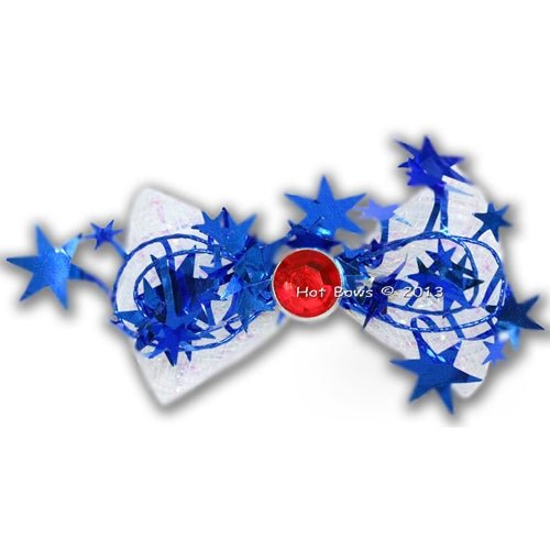 Red, White and Blue! Wear your loyalty and pride in your Hot Bows! This bigger bow is perfection! White ribbon mesh, blue sparkly stars float above the white ribbon and a perfect red crystal center. Ribbon is approx. 3" wide.