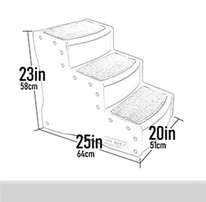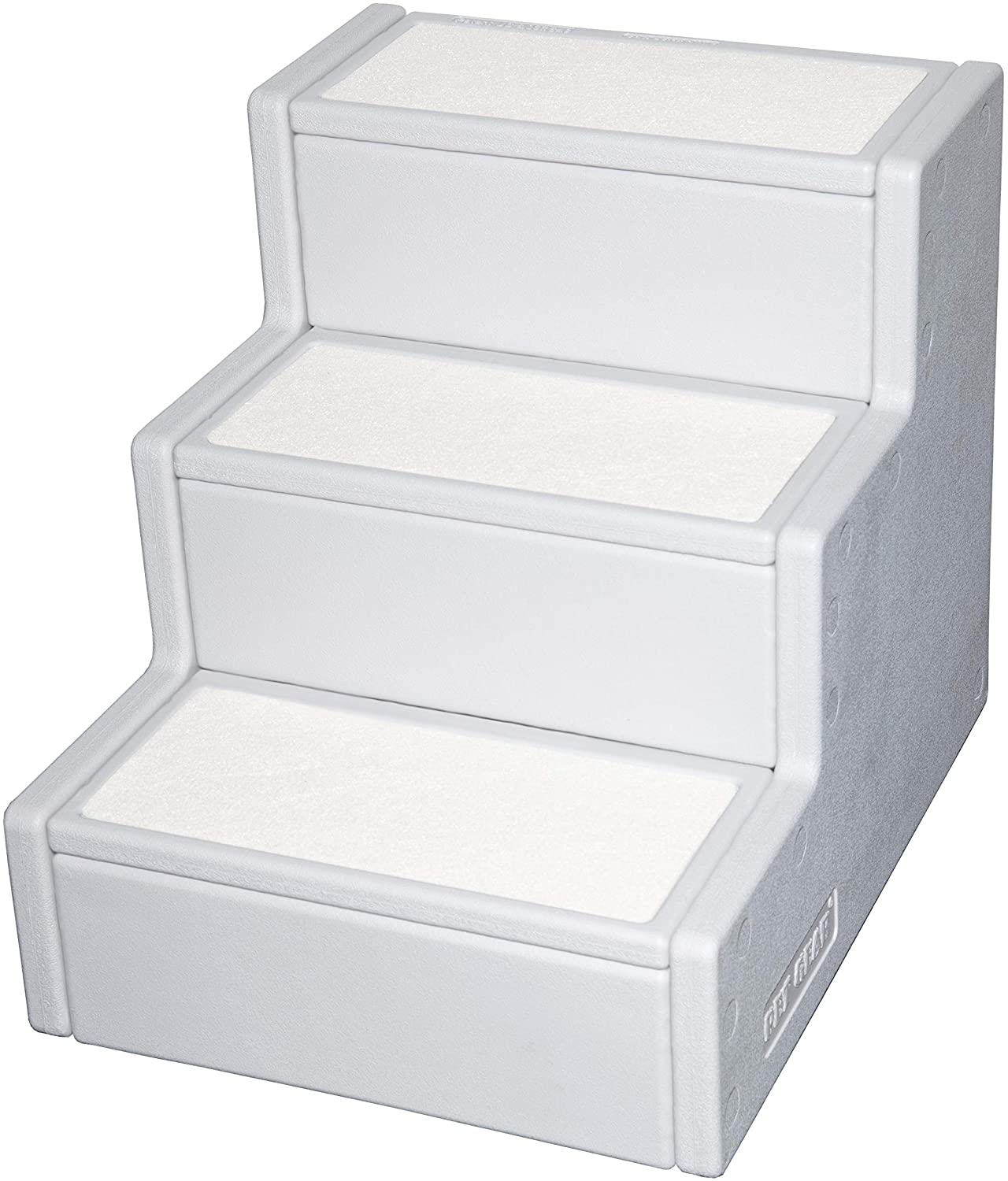 The Easy Step II Pet Stair has wide, deep steps to give smaller dogs the ability to get their entire body on each platform and large dogs the ability to comfortably climb the stairs. The innovative incline of each step reduces the amount of stairs needed to climb eliminating stress on your pet. The carpet tread removes easily and is machine washable. The stair easily snaps together (no tools required).