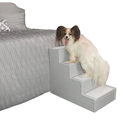 Pet Step 4 allows your dog the ability to get up to the bed with ease. The Pet Step 4 has rubber grippers on the bottom this keeps the step secure and in place while the pet is using the step. Assembly is easy just snap together no tools required!