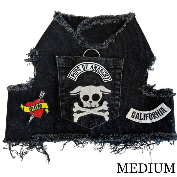 • Rev your engine and strap into the PUPS OF ANARCHY HARNESS - a rebellious look in black denim with biker-style patches! Patch sizes vary depending on harness size (pictured). Secure it with the hook and loop fastener, attach your leash to the D-ring, and don the thrifted denim pocket. Shades of denim may vary.