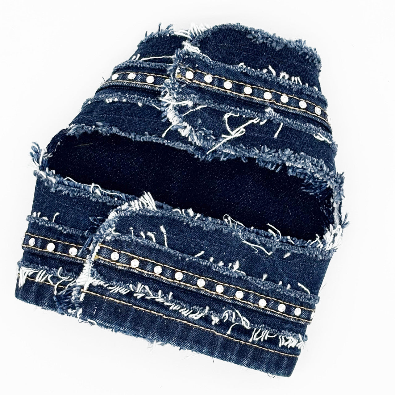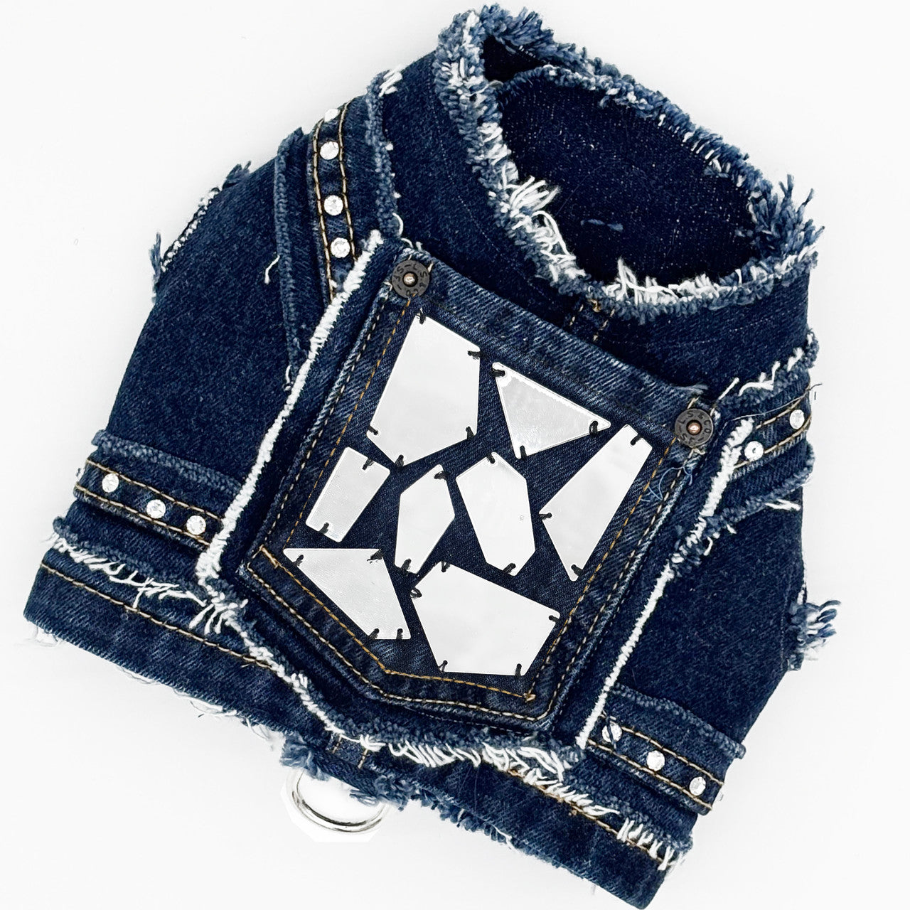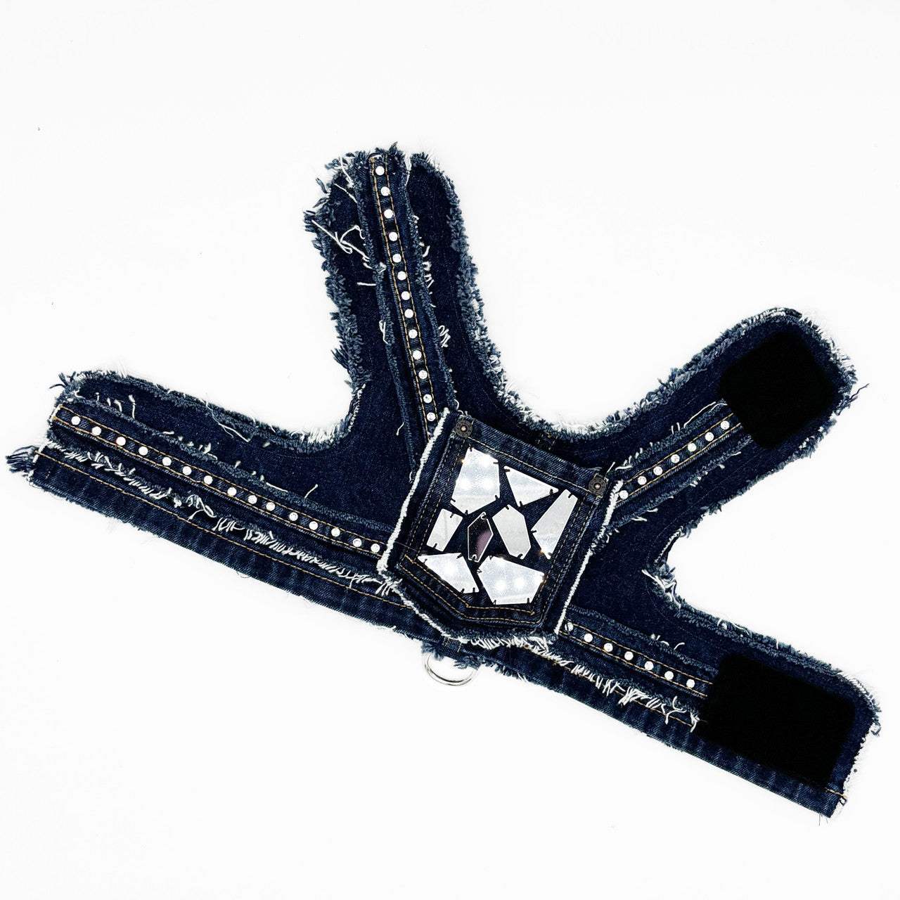 Add a touch of sparkle and creativity to your pup’s wardrobe with our "Reflections in Denim" Harness Vest, a truly unique piece made from recycled vintage jeans. Designed for small dogs with bold fashion sense, this vest blends rugged denim charm with eye-catching shimmer.