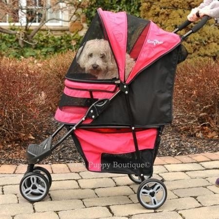 The perfect combination of mobility and style, the Regal stroller offers the luxury of three wheels (traditionally reserved for larger, more expensive models) in an affordable, convenient stroller. The Regal stroller will hold a dog or cat up to 25 pounds and has numerous little touches for extra convenience. The front convertible wheel swivels on smooth surfaces or locks on rough surfaces for easy traveling, while the extra storage pouches are perfect for your water bottle and other accessories Dont forget to get your Smart-Comfort pad, made with our simulated soft angora that is amazingly soft to the touch and easy to clean. Your pet will love the cozy softness. Model G2022SA (22 x 11 ) is a perfect fit. Smart-Features:
