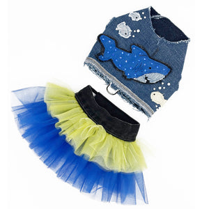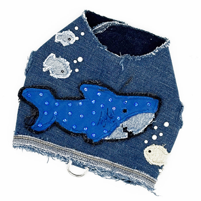 Product: Shark Attack Denim Harness Vest (skirt sold separately)Size Available: Small (S)Fit: Adjustable Velcro closures at neck and waistDesign Features: Shark and fish appliqué, blue rhinestones, white pearlsMaterial: Recycled vintage denim, rhinestones, faux pearlsSustainability: Eco-conscious and one of a kind—handmade from reclaimed denimCustom Orders: Available for dogs of all sizes (please allow 3–4 weeks for delivery)Practical Use: Strong yet comfortable—ideal for walking your dog and built to handle everyday wear