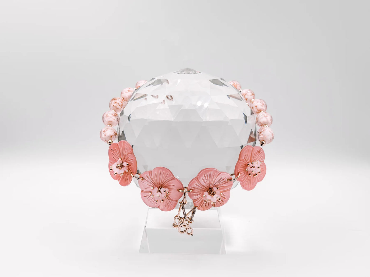 Introducing the Rosy necklace - a versatile piece of designed for both pets and humans. This exquisite necklace features delicate cherry blossoms charms paired with marbled pink beads, creating a perfect harmony of softness and sophistication. The floral accents are enhanced with gold detailing, adding a subtle sparkle to this timeless necklace.