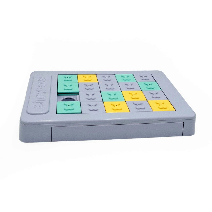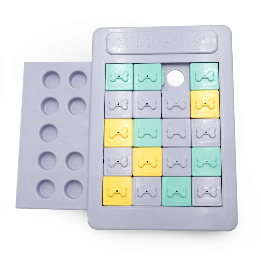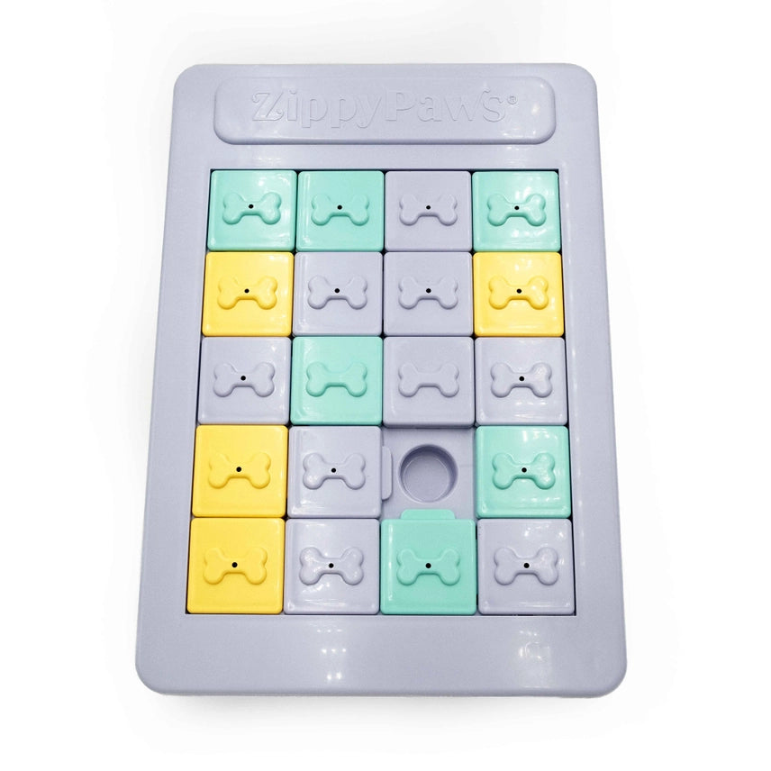 Challenge your pup to some rewarding brain-teasing fun with the SmartyPaws Puzzler Panel Sliders dog toy! The all-new panel sliders interactive toy from ZippyPaws teaches them problem solving skills for a fun and engaging way to receive treats or kibble! Panel Sliders feature sliding panels with raised bone designs that your dog must move to access the treats inside. Two of the panels are stationary for added difficulty.