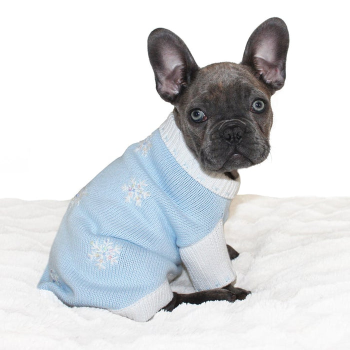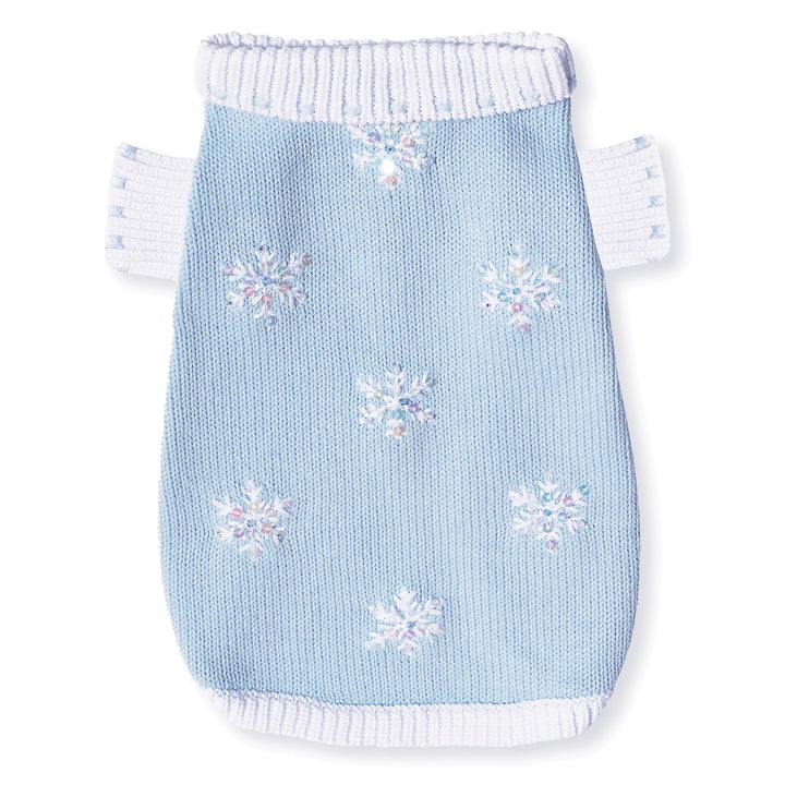 The white, folded ribbed collar and sleeves are embroidered with tiny blue stitching, while the ribbed hem provides warmth and comfort. This sweater is sure brighten up your fashionista’s winter wardrobe.