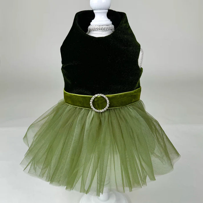Add a touch of magic to your wardrobe with our Sugar Plum Fairy Dress. Made with hand-dyed velvet and the softest tulle, this dress is perfect for any occasion, in Plum Purple and Sage Green. The romantic velvet belt features a rhinestone jeweled buckle and a convenient hook and loop closure. layered on a cotton denim harness for structure and functionality.