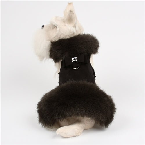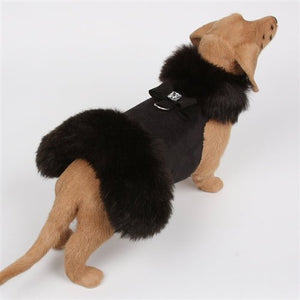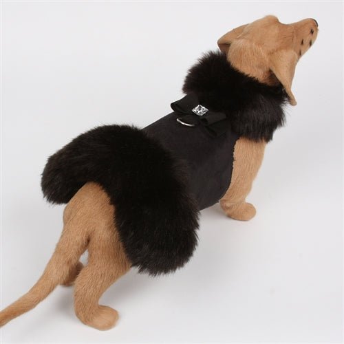 This plush faux fur accents our Luxe Suede coat with Chenille lining is accented with a Big Bow embellishment and a “D” ring for attaching a leash. Lastly, this coat is manufactured in the USA.