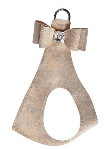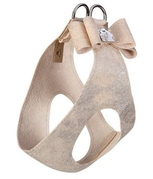 Our new favorite... The Glitzerati Collection! A hint of shimmer adds another level of beauty to the already gorgeous Ultrasuede. This foil like effect is embedded into the Ultrasuede so that none of this glitz will rub off or wash out. Just like our solid Ultrasuede's, use after use, wash after wash, this timeless fabric will maintain it's beauty. Also known as the Pure & Simple, this harness fastens by a single quick-release buckle located above the dogs’ shoulders and is cut well below the dogs’ neck so the pulling is across the shoulders and not the neck. The end result is pure comfort for the dog. Easy for you to maintain, this harness, including the Glitzerati Big Bow centered with a Swarovski Crystal button, is made from genuine commercial upholstery grade Ultrasuede® fabric that we import from Japan. This soft, comfortable fabric is breathable, washable and colorfast. As an assurance to both you and your customer, each item comes with an Ultrasuede® tag with instructions on the back for cleaning and maintenance. Manufactured in the USA