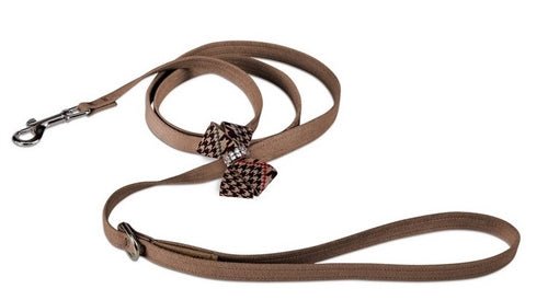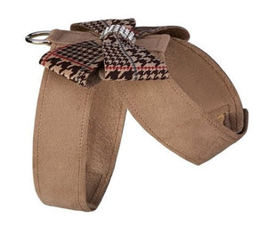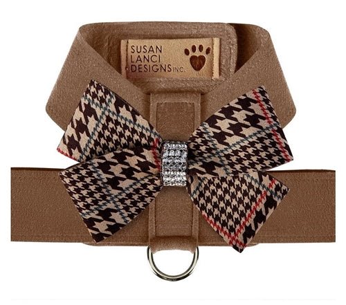 This Classic Glen Houndstooth Tinkie is the perfect canvas for our timeless Nouveau Bow centered with stunning rows of genuine Swarovski Giltmore crystals. Simply and beautifully made with an indestructible material, this harness is a good value that will last a long time. Hook and loop under belly closure allows for no fuss put on and take off action. Like all of our designs, it is made from genuine commercial upholstery grade Ultrasuede® fabric that we import from Japan. This soft, comfortable fabric is breathable, washable and colorfast. As an assurance to both you and your customer, each item comes with an Ultrasuede® tag with instructions on the back for cleaning and maintenance.