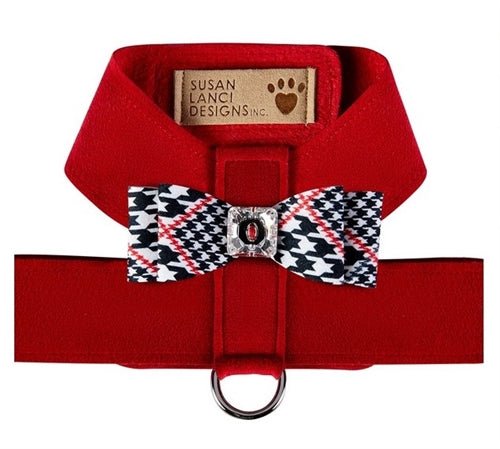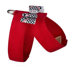 This Classic Glen Houndstooth Tinkie is the perfect canvas for our timeless Nouveau Bow centered with stunning rows of genuine Swarovski Giltmore crystals. Simply and beautifully made with an indestructible material, this harness is a good value that will last a long time. Hook and loop under belly closure allows for no fuss put on and take off action. Like all of our designs, it is made from genuine commercial upholstery grade Ultrasuede® fabric that we import from Japan. This soft, comfortable fabric is breathable, washable and colorfast. As an assurance to both you and your customer, each item comes with an Ultrasuede® tag with instructions on the back for cleaning and maintenance.