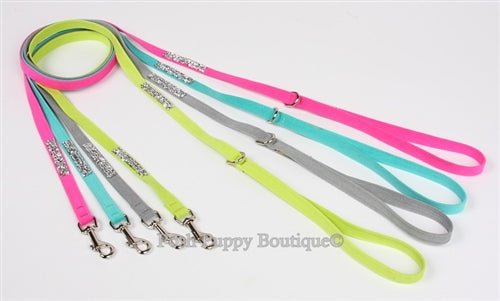Our leashes come in every color and design to match all of our collars and harnesses. The snap hook has a heavy plated nickel-silver finish and each leash has a matching D ring located just below the hand look great for keys, pick-up bags or attaching our Travel Pouch (see our Travel Pouch tab). Light weight and comfortable for you, easy to maintain and constructed from a commercial grade material, this leash is a good value that will last a long time. Like all of our designs, it is made from genuine commercial upholstery grade Ultrasuede® fabric that we import from Japan. This soft, comfortable fabric is breathable, washable and colorfast. Lastly, this leash is manufactured in the USA. Collar can be added for an additional amount.