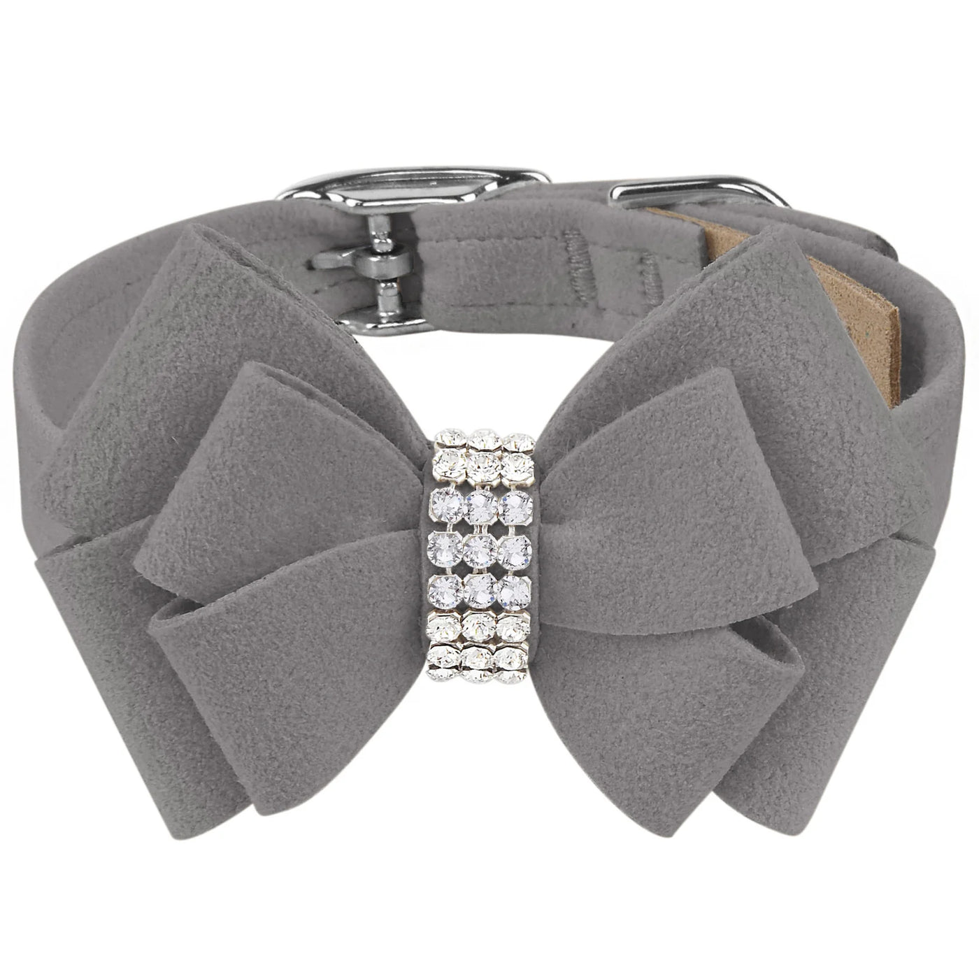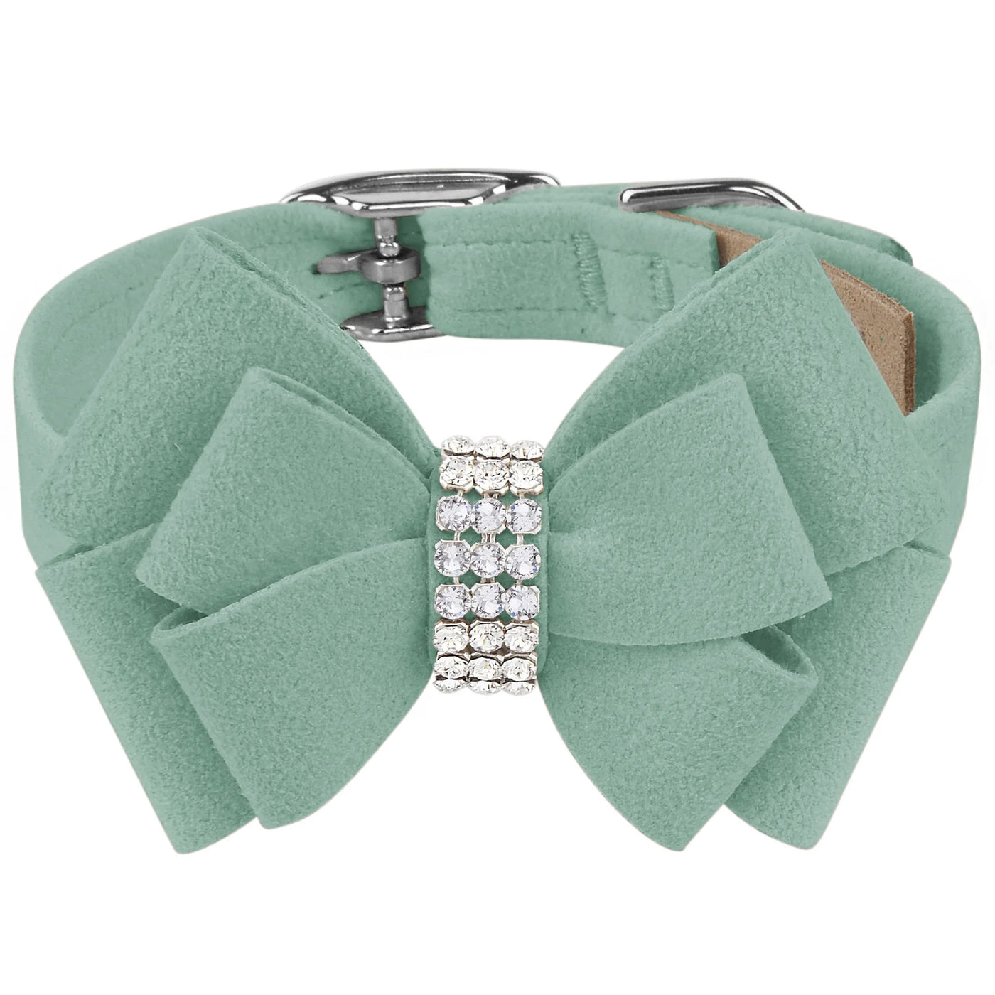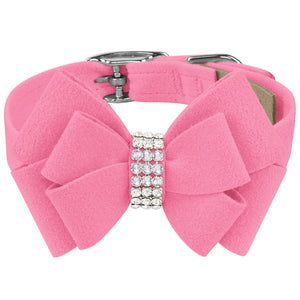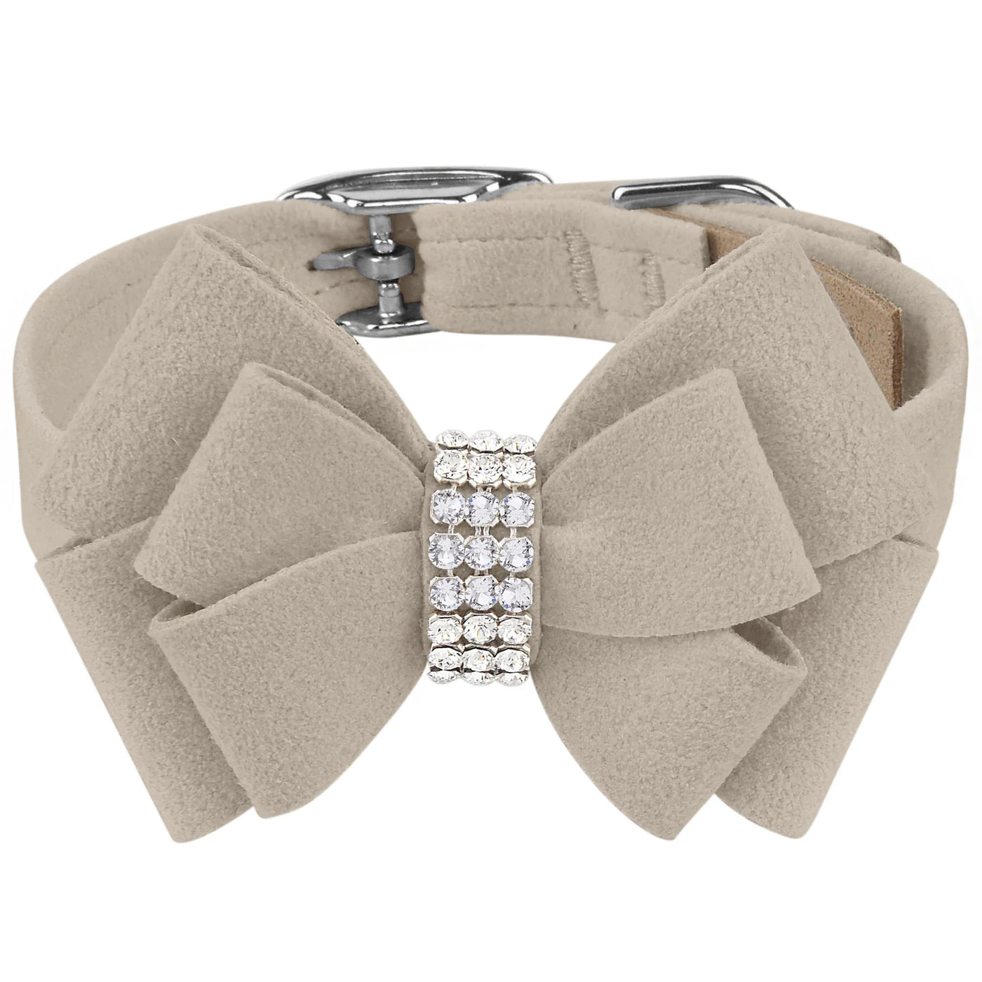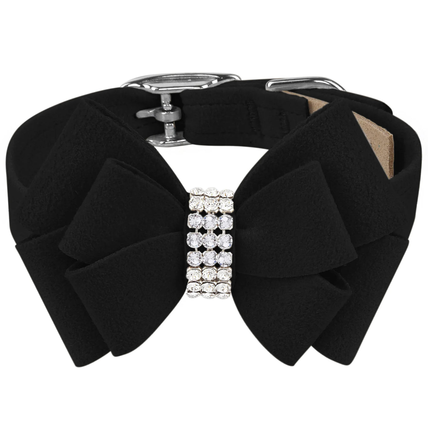 The Nouveau Bow captures all attention with bold curves embraced by rows of gleaming Swarovski Crystals. Comfortable for the dog, easy for you to maintain. In addition to that, the fabric gives you a wide range of colors – from soft pastels to vibrant hues. Like all of our designs, this 1/2 inch collar is made from genuine commercial upholstery grade Ultrasuede® fabric that we import from Japan. This soft, comfortable fabric is breathable, washable and colorfast. This collar is manufactured in the USA.