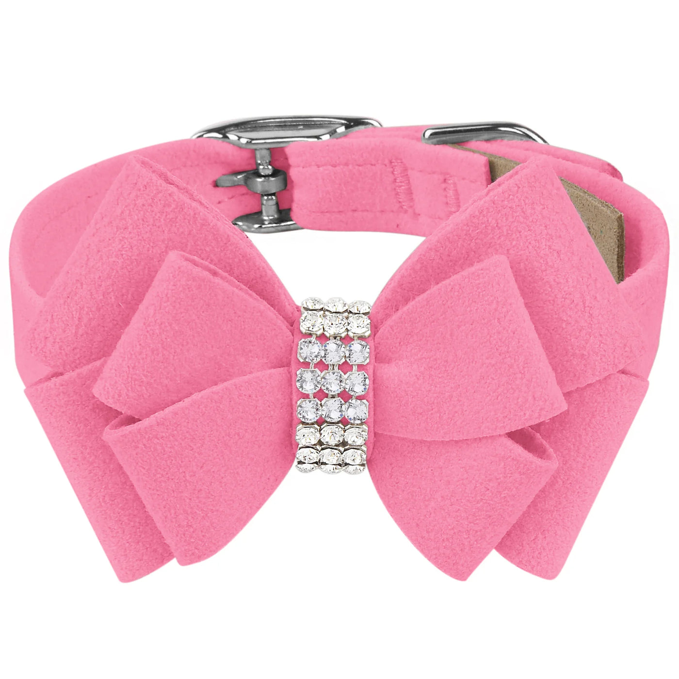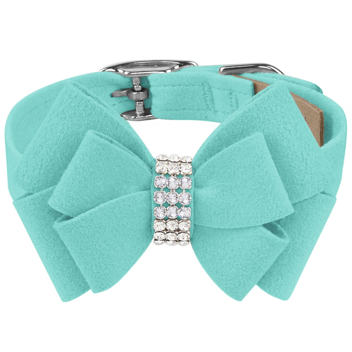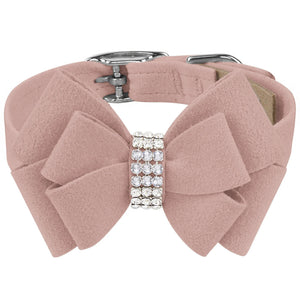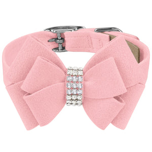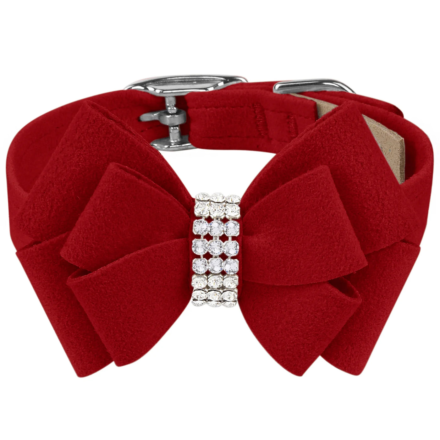 The Nouveau Bow captures all attention with bold curves embraced by rows of gleaming Swarovski Crystals. Comfortable for the dog, easy for you to maintain. In addition to that, the fabric gives you a wide range of colors – from soft pastels to vibrant hues. Like all of our designs, this 1/2 inch collar is made from genuine commercial upholstery grade Ultrasuede® fabric that we import from Japan. This soft, comfortable fabric is breathable, washable and colorfast. This collar is manufactured in the USA.