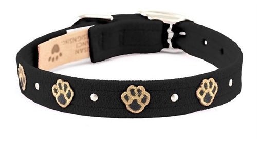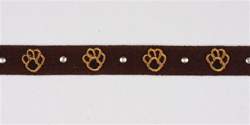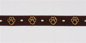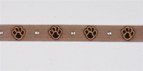 Here is a great collar for those who desire a quality, understated, subtle design. This is a design that will work well for both boys and girls. The paws on the Chocolate collar are separated by polished studs; the other collars use Swarovski crystal. Like all of our designs, it is made from genuine upholstery grade Ultrasuede® fabric that we import from Japan. This soft, comfortable fabric is breathable, washable and colorfast. As an assurance to both you and your customer, each item comes with an Ultrasuede® tag. Manufactured in the USA. Collars limited to three colors.
