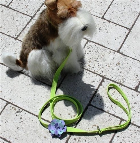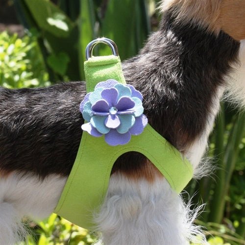 Pure & Simple comfort and ease. This harness fastens by a single quick-release buckle located above the dogs’ shoulders and is cut well below the dogs’ neck so the pulling is across the shoulders and not the neck. Easy for you to maintain, this harness is made from genuine commercial upholstery grade Ultrasuede® fabric that we import from Japan. This soft, comfortable fabric is breathable, washable and colorfast. As an assurance to both you and your customer, each item comes with an Ultrasuede® tag with instructions on the back for cleaning and maintenance. The Emma flower is centered with a genuine Swarovski Crystal button.